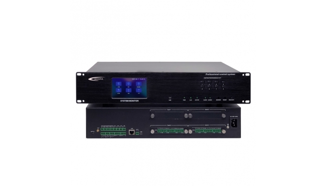功能特征 1、1.5U机箱标准机柜设计,编程简单易学,可通过串口单独控制 2、主机自带8个自定义按键,自定编程。比如投影机开/关 幕布升降等功能 3、全面支持第三方设备及控制协议,可自行设置多种控制协...