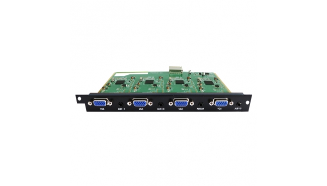 产品描述: VGA4高清输入板卡,配合数字高清混合矩阵主机使用,采用独立板卡设计,每块卡支持4路VGA信号输入,将VGA模拟视频信号转化成高性能的数字高清图像进行传输。 产品性能 1、4路DB15接口...