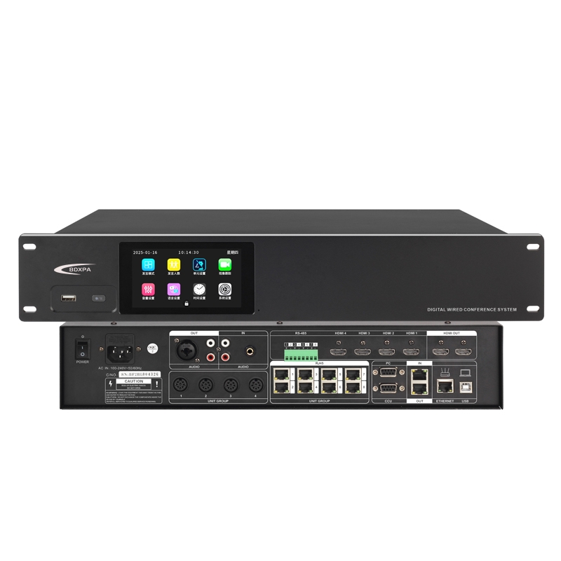 •具有8路RJ45的话筒单元接口,采用闭环以太网链接模式,支持话筒单元的双边供电,且支持话筒单元热插拔,每路支持10个单元,最大可接80个单元