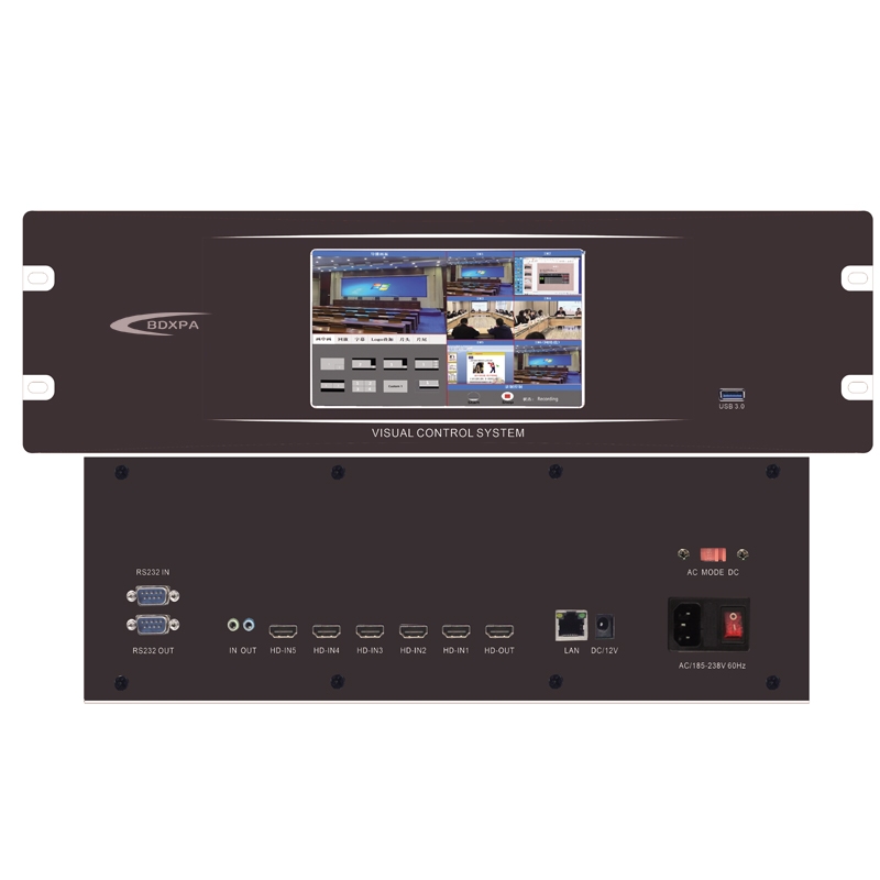 7、前面板带有7寸可触摸屏显示屏,支持多流视频直播,6路直播画面可以任意切换位置,并且可以对每1路画面进行全屏处理