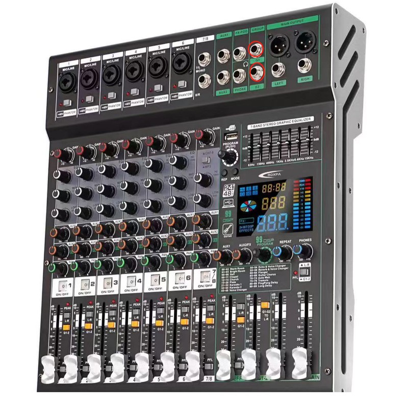 ◆内置99种DSP数字效果器,内置USB播放器,MP3播放,USB直插录音,内置蓝5.0接收播放,USB音频声卡(连接 电脑)将电脑播放的声音传输到调音台